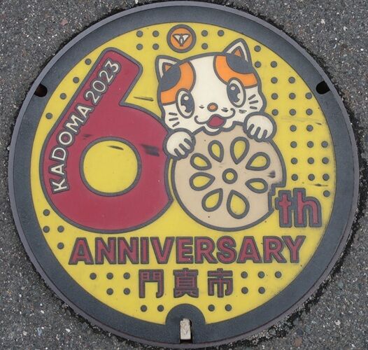 門真市のマンホールの蓋 2025年12月04日 今回は門真市の蓋を紹介します。市制施行60周年記念の蓋で市のイメージキャラクター「ガラスケ」がデザインされています。市役所の南側の信号交差点に有りました。続きます。 タグ :##門真市のマンホール##大阪府のマンホール