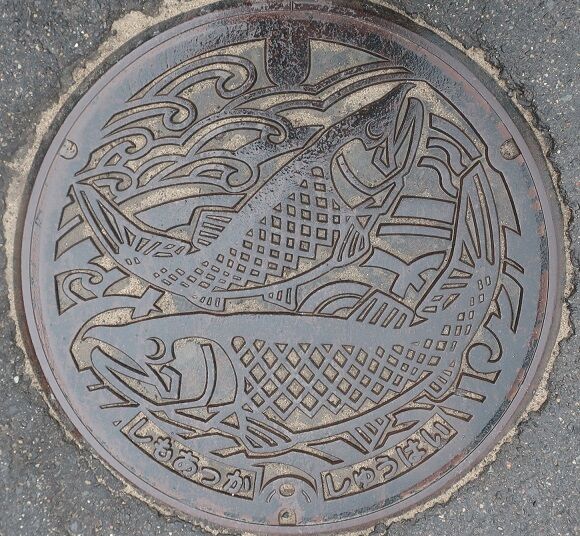 鮭がデザインされています。玉川第2地割64に在る「小野旅館」の近くの路上に有りました。