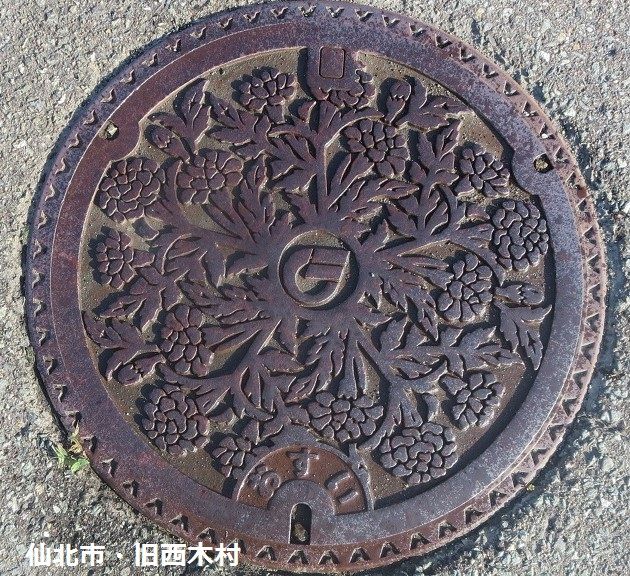 旧西木村の蓋で村の花マリーゴールドがデザインされています。