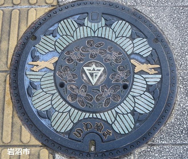 市章と市の花ツツジ、市の木黒松、仙台空港(在岩沼市&名取市)から飛び立つ飛行機がデザインされています。七十七銀行前歩道に有りました。