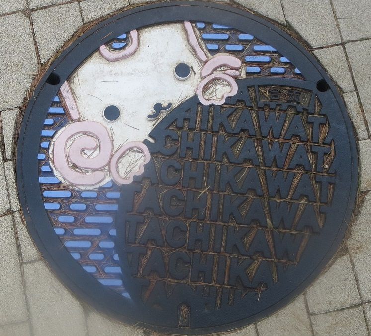 市のキャラクター「くるりん」がデザインされています。多摩モノレール立川南駅の近くに在る「信濃大町アルプスプラザ」の前の歩道に有りました。