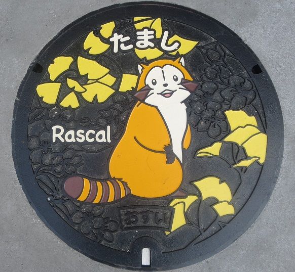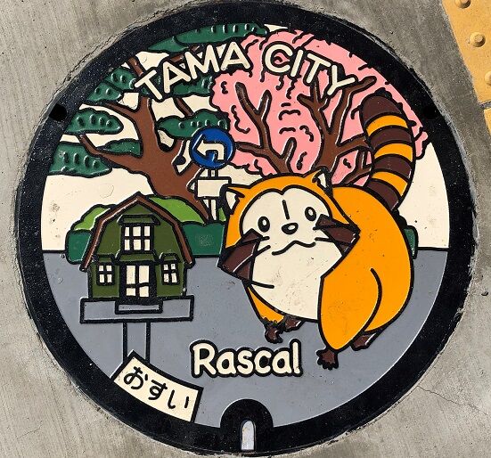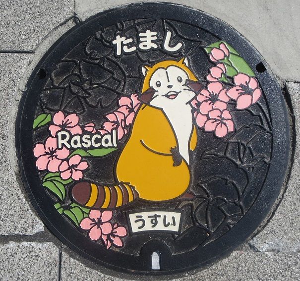 市の花山桜と市の木銀杏の葉(ノンカラー)、「あらいぐまラスカル」がデザインされています。市と「日本アニメーション㈱」が地域活性化に関する提携協定を締結しているそうです。京王電鉄㈱本社ビルの北東に在る横断歩道を渡った所に有りました。
