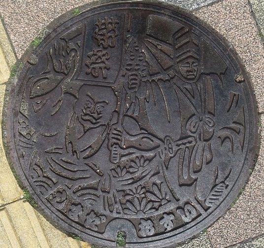 「帯祭り」と松の木の枝がデザインされています。「帯祭り」は日本三大奇祭の一つだそうです。「からくり時計」の前の歩道に有りました。