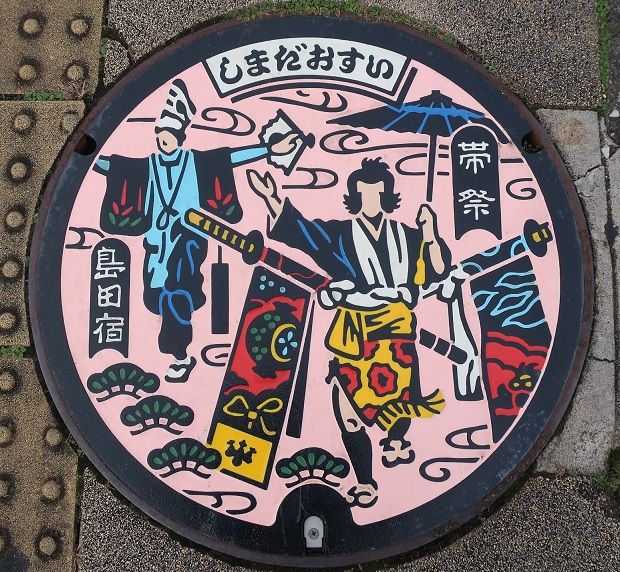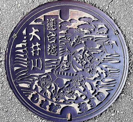 橋を架けることが禁じられていた大井川を越すための「蓮台(河川を越すために人を乗せた乗り物)越」と「富士山」がデザインされています。「箱根八里は馬でも越すが 越すに越されぬ大井川」の馬子唄は有名です。大井川蓬莱橋渡橋受付の前に有りました。
