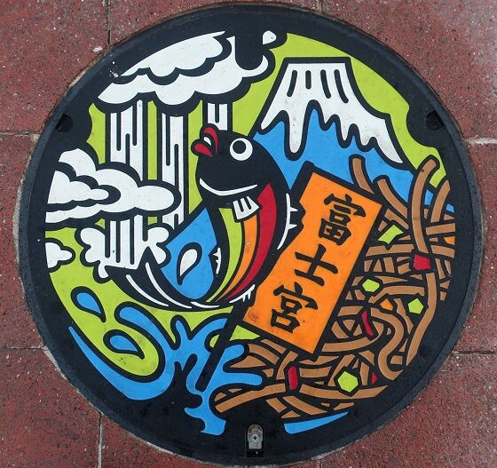 「富士山」と湧水の観光名所「白糸の滝」、その湧水に育まれた虹鱒、有名なB旧グルメ「富士宮焼きそば」がデザインされています。「富士急ホテル」の前の歩道に有りました。