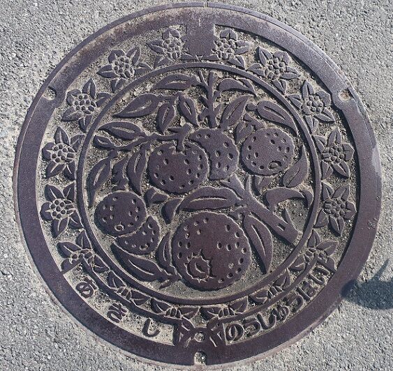 躑躅と生産量が日本一の柚子がデザインされています。安芸奈比賀簡易郵便局の傍の路上に有りました。