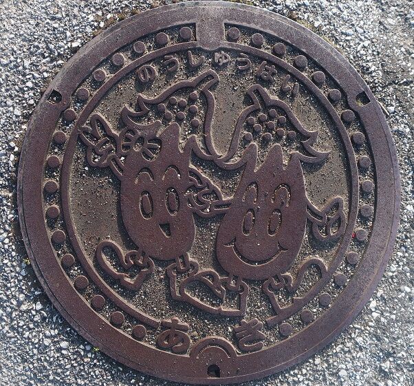 特産品の茄子のキャラクター「あなないナスビさん」がデザインされています。安芸赤野郵便局の傍の路上に有りました。
