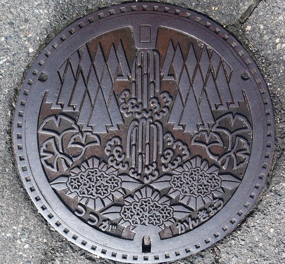 旧筒賀村の蓋でいくつもの村章(3本杉)で描いた杉山と村の花石楠花、村の木銀杏の葉、龍頭峡奥の滝と二段滝がデザインされています。中筒賀1553辺りの路上に有りました。