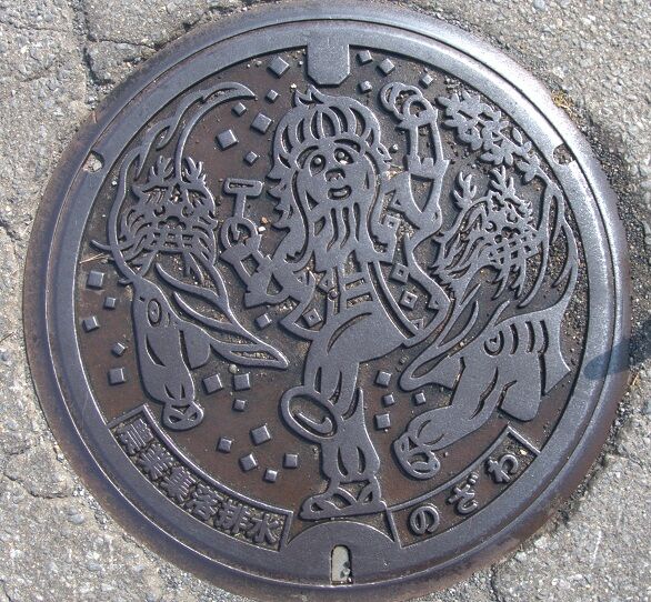 次の蓋と共に野沢地区に伝わる「獅子踊り」がデザインされています。野沢小学校の正門前の路上に有りました。