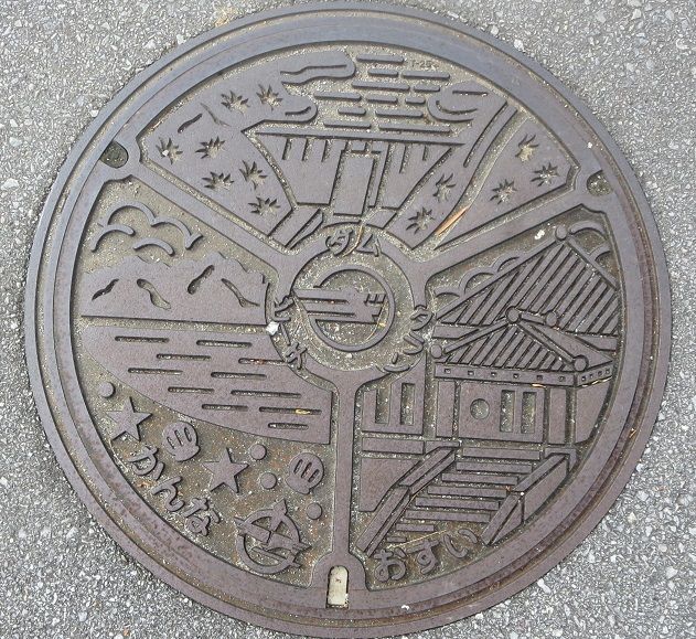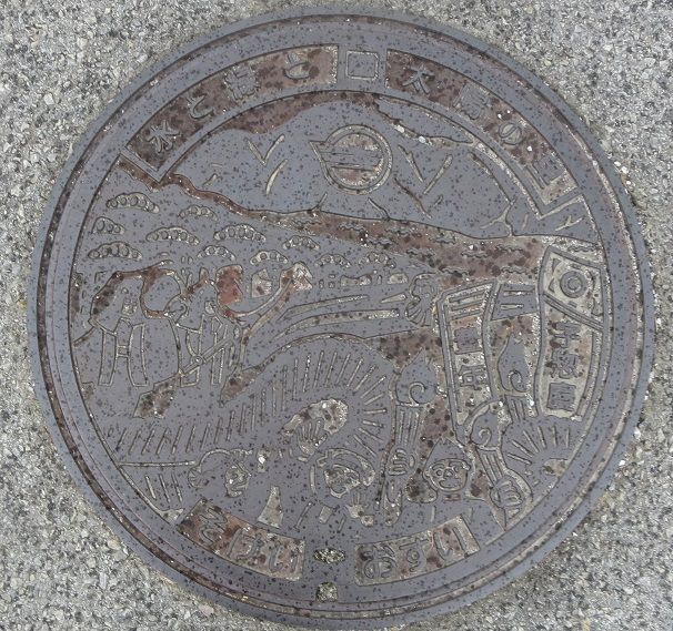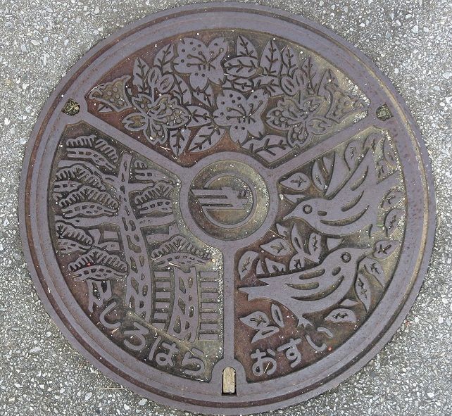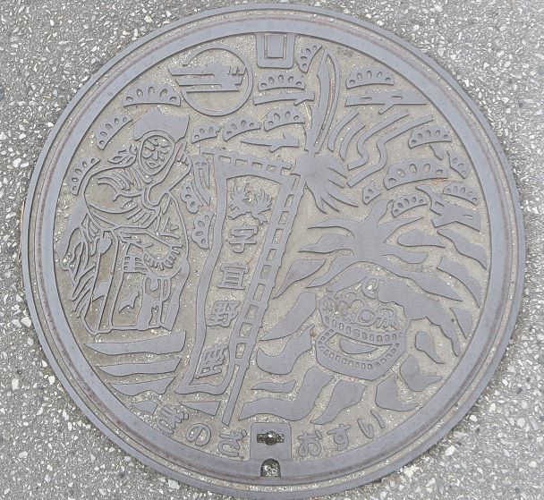 村章と琉球松、シーサー、古知屋岳がデザインされています。松田1048辺りの路上に有りました。
