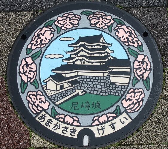 夾竹桃と「尼崎城」がデザインされています。「デイリーヤマザキ阪神尼崎駅前店」の前の歩道に有りました。