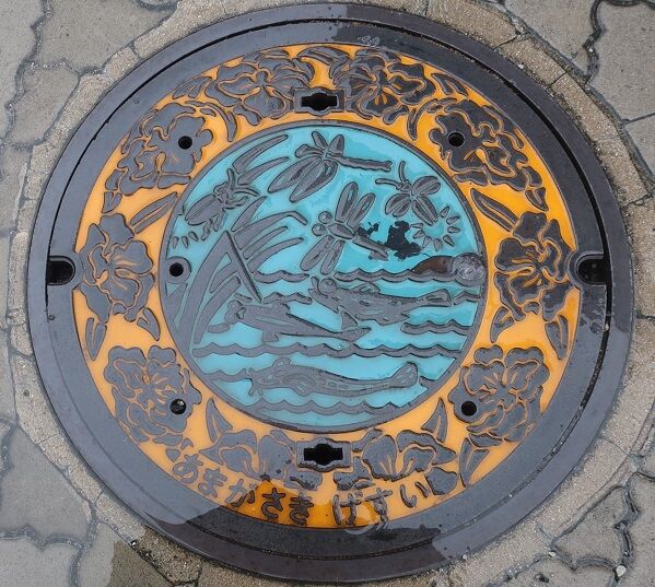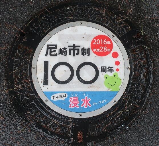市の花夾竹桃と蜻蛉、蛍、魚がデザインされています。「都ホテル尼崎」の前の歩道に有りました。