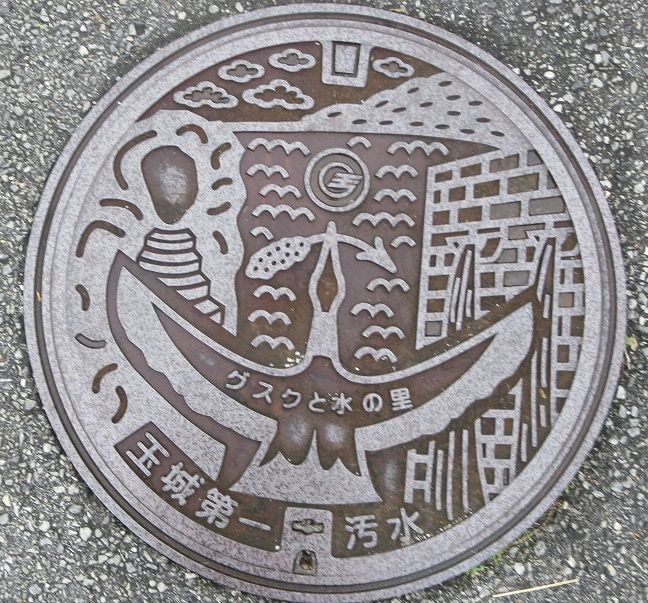 旧玉城村の蓋で村章と城の石垣、湧水がデザインされています。玉城堀川に有りました。
