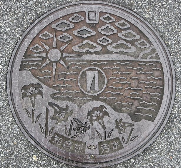 旧知念村の蓋で村章と村の花テッポウユリ、太陽が輝く海がデザインされています。知念志喜屋521-4に有りました。