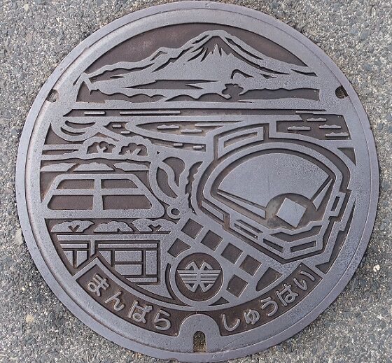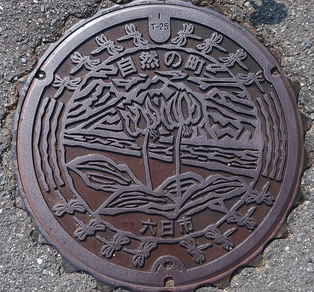 次の蓋と共に旧日原町の蓋で町章と町の花向日葵、天文台と満天の星がデザインされています。日原駐在所の傍の路上に有りました。