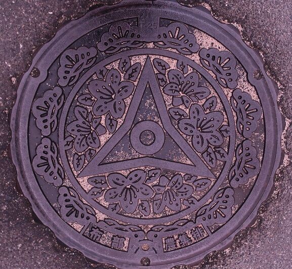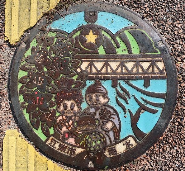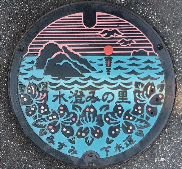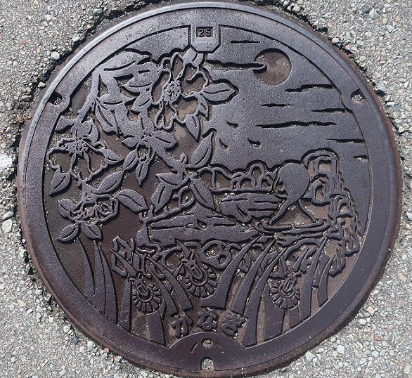 次の2枚の蓋と共に旧三隅町の蓋で町の花躑躅と日本海の夕日がデザインされています。市役所三隅支所への入口に在る電話ボックスの傍の路上に有りました。