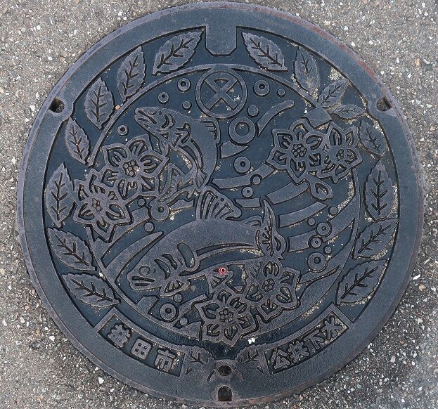 市章と市の花水仙、市の木欅の葉、高津川の鮎がデザインされています。高津川は国内で唯一のダムの無い(支流も含め)一級河川だそうです。あけぼの本町3-1の路上に有りました。