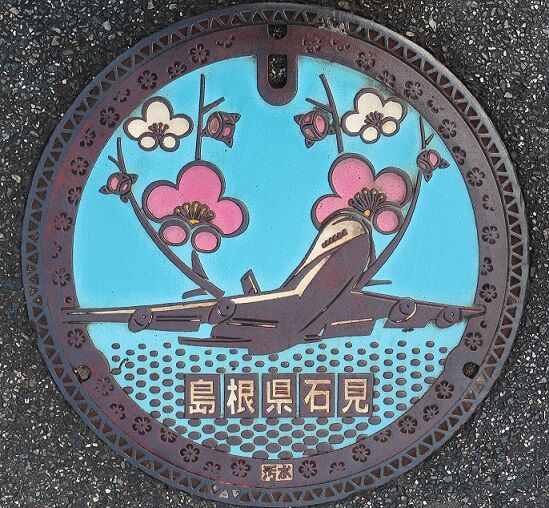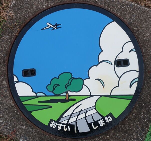 山陰道沿線活性化協議会の蓋でがデザインされています。風の丘公園から石見空港を飛び立つ飛行機と日本海の入道雲を眺めた風景がデザインされています。空港の建物の東側の駐輪場の傍に有りました。