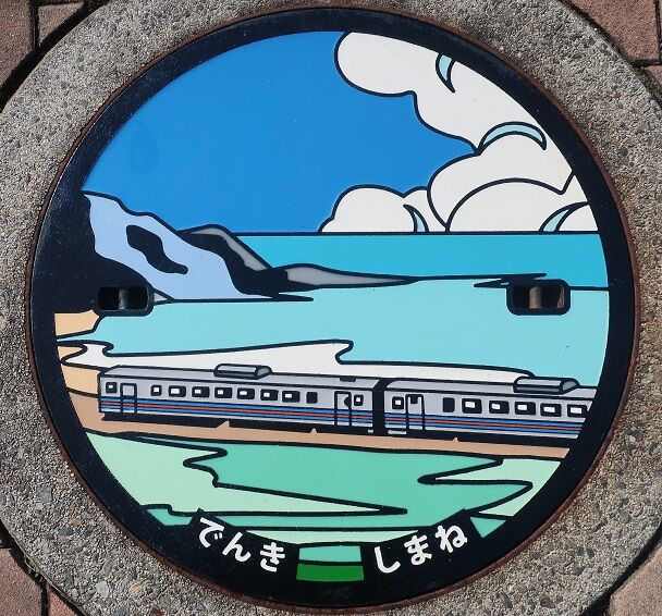 山陰道沿線活性化協議会の蓋で海岸線を走る電車と日本海の入道雲がデザインされています。「道の駅 ゆうひパーク三隅」の障害者用駐車場の傍に有りました。
