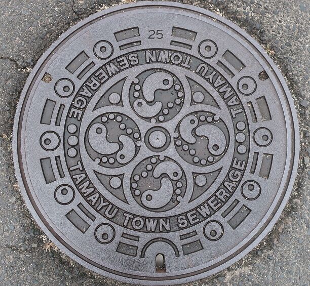 次の蓋と共に旧玉湯町の蓋で勾玉と管玉がデザインされています。玉湯町玉造1037の路上に有りました。