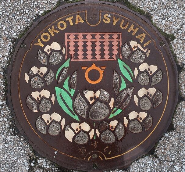 旧八雲村の蓋で村章と村の花ミツバツツジ、星空と蛍がデザインされています。八雲町日吉173の路上に有りました。