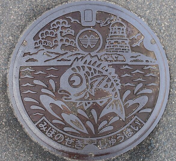 森山地区の蓋で市章と鯛がデザインされています。美保関町森山650の路上に有りました。