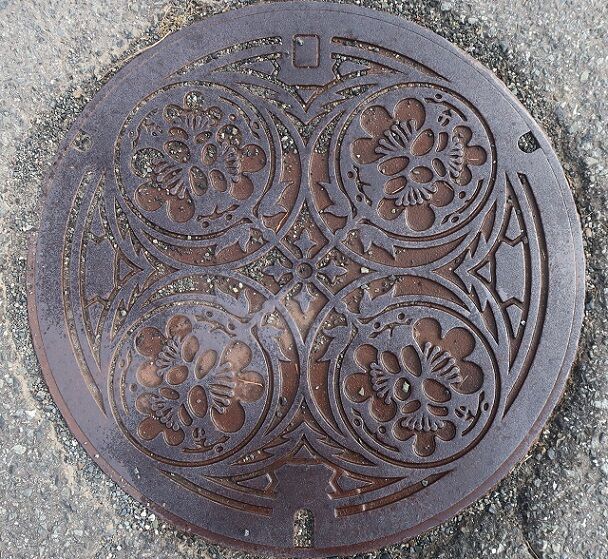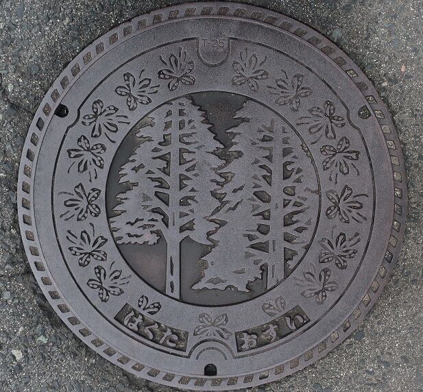 旧弥栄村の蓋で村の花梅と村の木杉がデザインされています。市役所弥栄支所の前の路上に有りました。