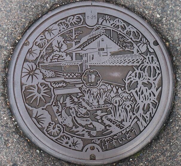 旧金城(かなぎ)町の蓋で町の花山茶花と蛍、満月を見ながら温泉に浸かる女性がデザインされています。金城町七条ハに在る「藤田緑化産業」の前の路上に有りました。