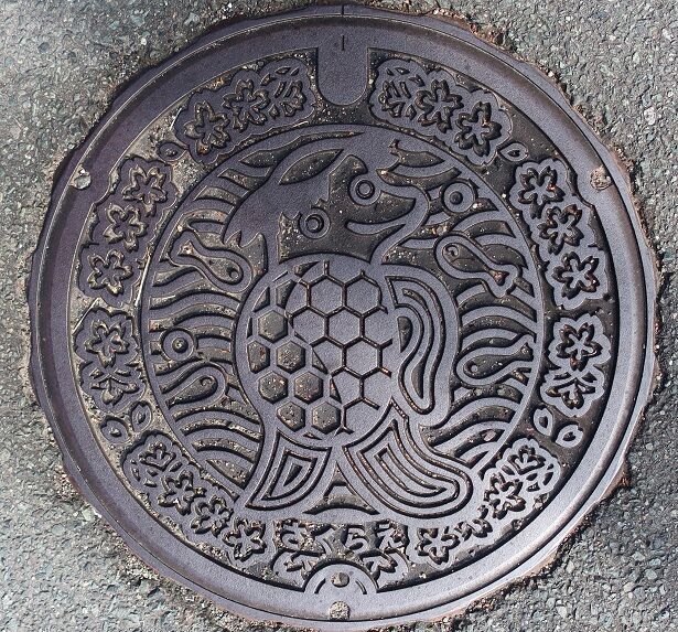 梅の花と益田川を泳ぐ鯉がデザインされています。横田町193の路上に有りました。