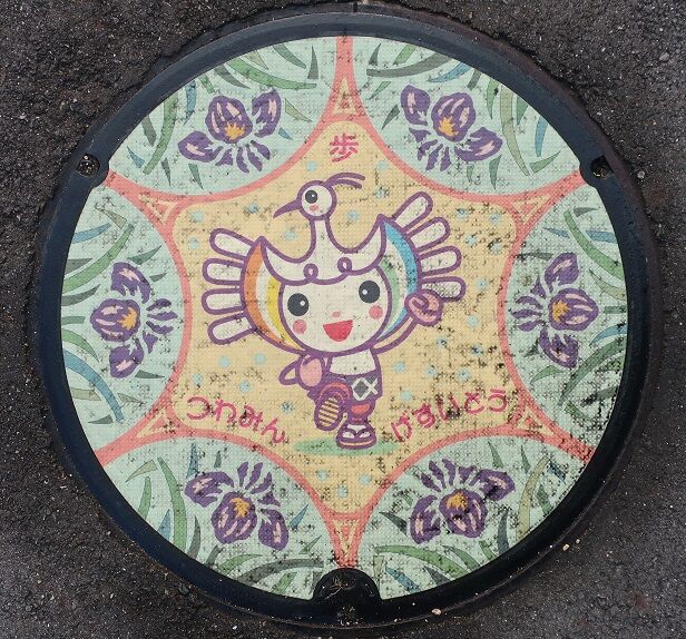 花菖蒲と町のイメージアップキャラクター「つわみん」がデザインされています。「道の駅 津和野温泉なごみの里」のトイレの傍の歩道に有りました。