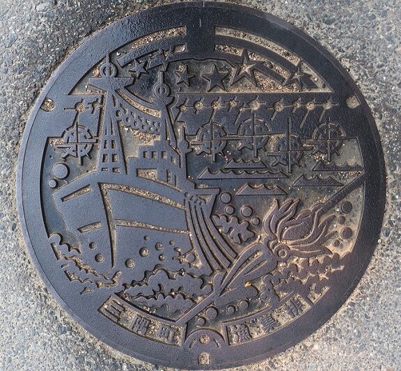 次の4枚の蓋と共に旧美保関町の蓋で町章と鯛、「美保関灯台」、民謡「関の五本松」に謡われている松がデザインされています。美保関町美保関に在る「かもめ亭」の近くの路上に有りました。