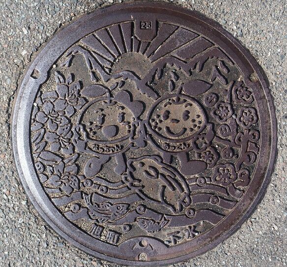 旧旭町の蓋で躑躅と梅、町のマスコットキャラクター梨の「あっくん」と「なっちゃん」、昇る朝日、ウリ坊と盛り沢山にデザインされています。旭町丸原1215の路上に有りました。