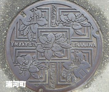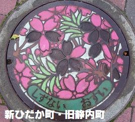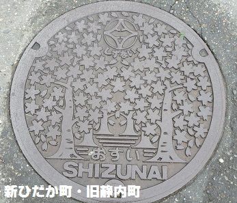 旧静内町の蓋で町の木エゾヤマザクラがデザインされています。静内エクリスプホテル前の道路の歩道にありました。