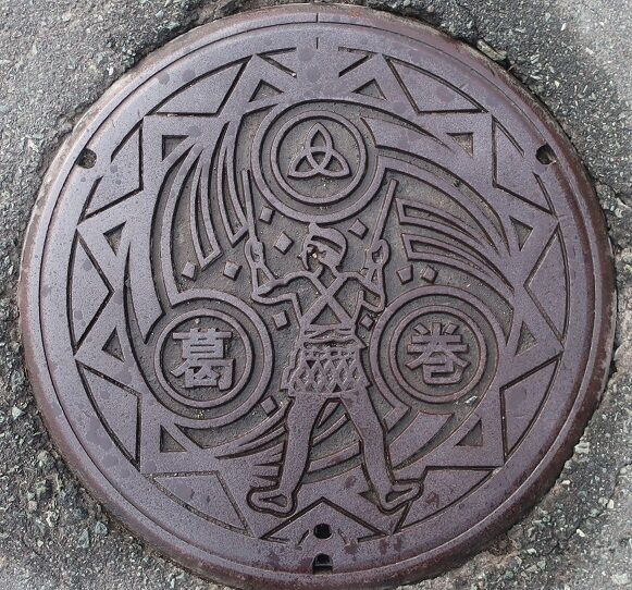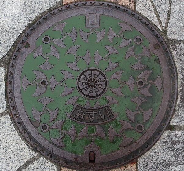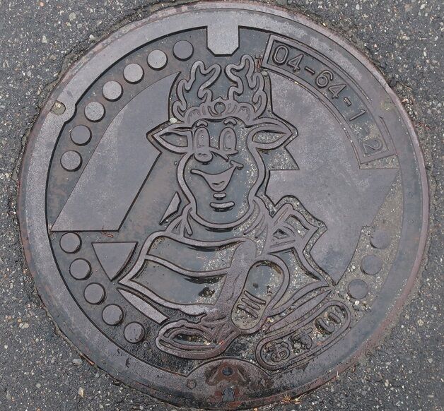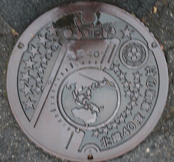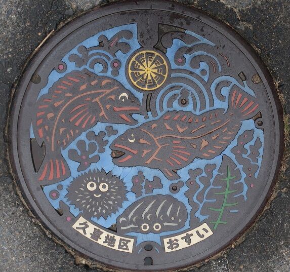 旧久慈市の蓋で市章と太平洋の荒波、魚、ウニ、アワビ、ワカメと盛沢山にデザインされています。宇部町に在る「久喜保育園」の近くの路上に有りました。