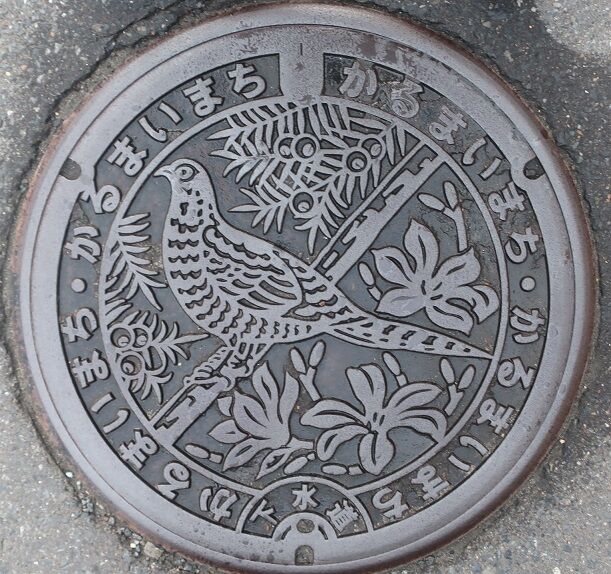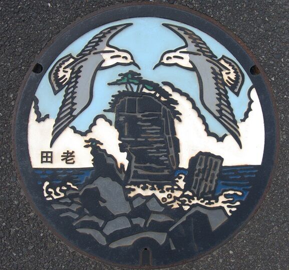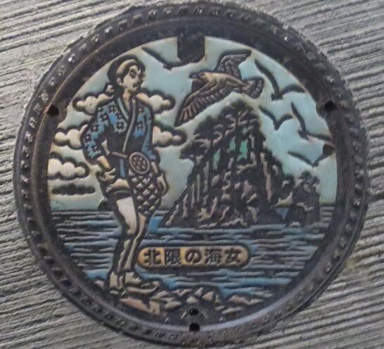 旧久慈市の蓋で小袖海岸の風景と海女さん、鴎がデザインされています。海女さんの腰に旧市章が有ります。「小袖海女センター」の傍に有りました。