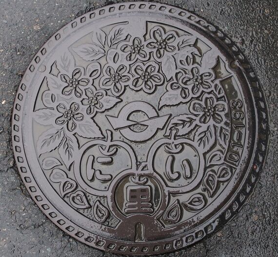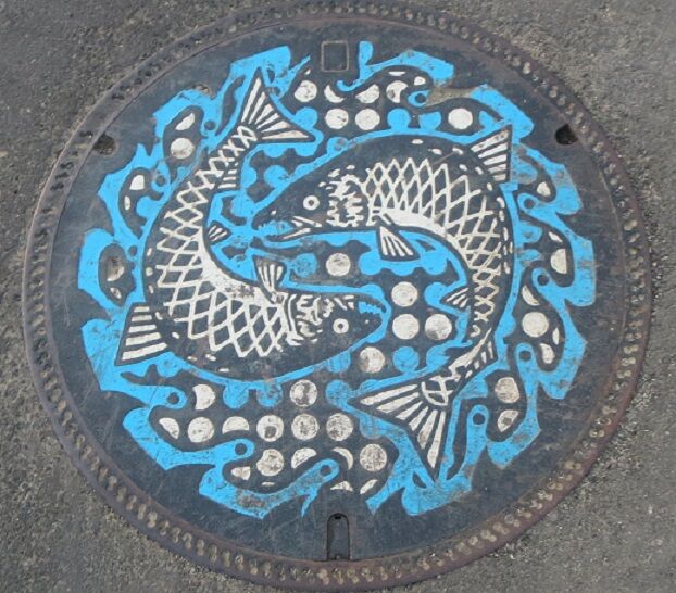東日本大震災で被害を受けた「もぐらんぴあ水族館」の復旧を支援して久慈市の復興に一役買ったさかなクンがデザインした蓋です。さかなクンと鮭の稚魚、雌雄の成魚がデザインされています。JR八戸線久慈駅西口ロータリーに有りました。