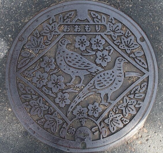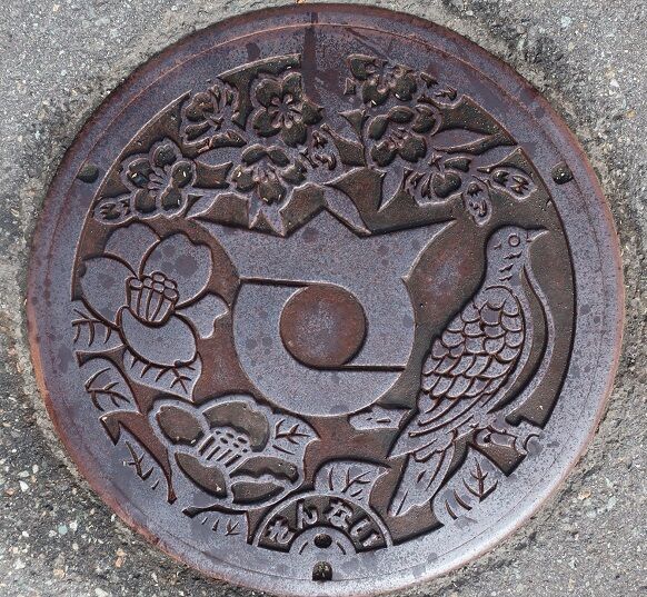 旧大森町の蓋で町の花ヤマツツジと町の木桜の花、町の鳥山鳥がデザインされています。大森町大中島347-4の路上に有りました。