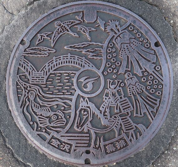 市章と源義家、厨川の片目カジカ、平安の風わたる公園内の橋と雁、小正月行事の「ぼんでん」がデザインされています。金沢本町荒町53の路上に有りました。