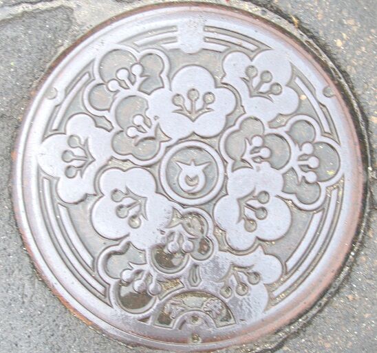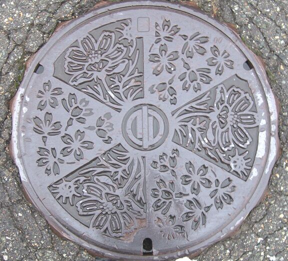 旧山内村の蓋で村章と村の花雪椿、村の木紅山桜の花、村の鳥山鳩がデザインされています。山内土渕小田69の歩道に有りました。
