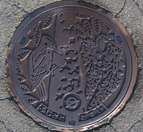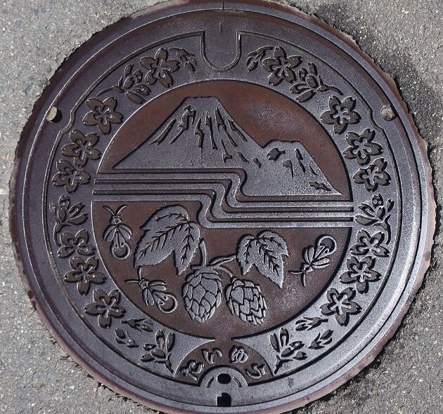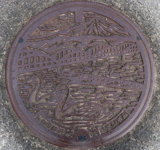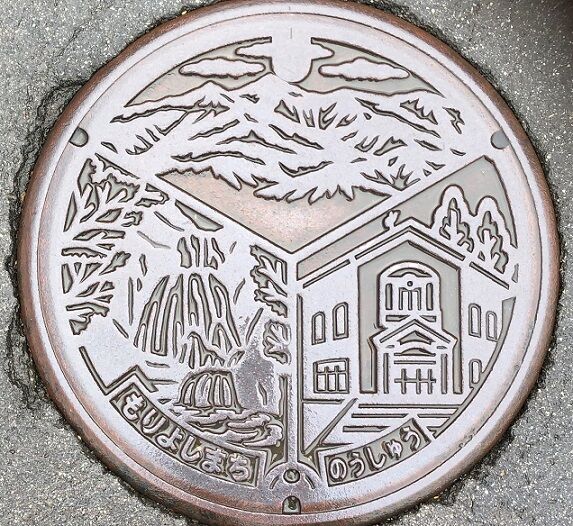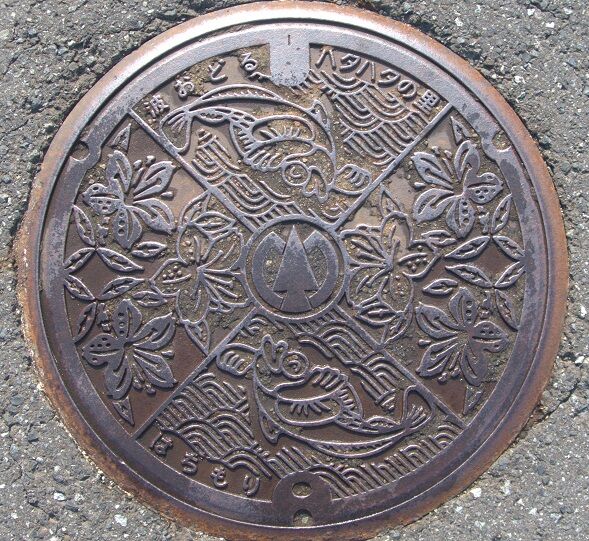 旧六郷町の蓋で町の木銀杏と町のマスコットキャラクター「コボちゃん」の従兄弟の「ユウちゃん」がデザインされています。六郷本道町に在る「藤清水(六郷湧水群)」の傍の路上に有りました。
