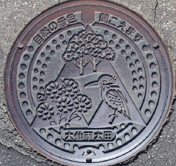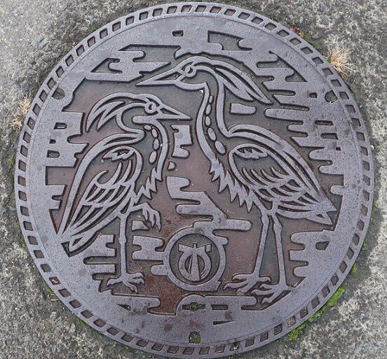 旧雄物川町の蓋で町章とアオサギがデザインされています。「雄物川郷土資料館」の近くの路上に有りました。