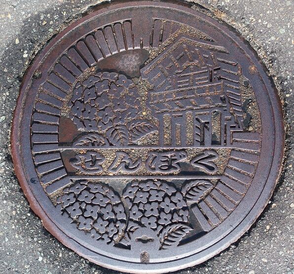 旧仙南村の蓋で村の花菖蒲と村の木銀杏、村の鳥雁がデザインされています。野荒町に在る「さいとう建設」の傍の路上に有りました。