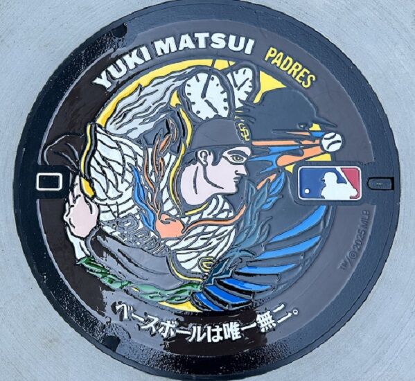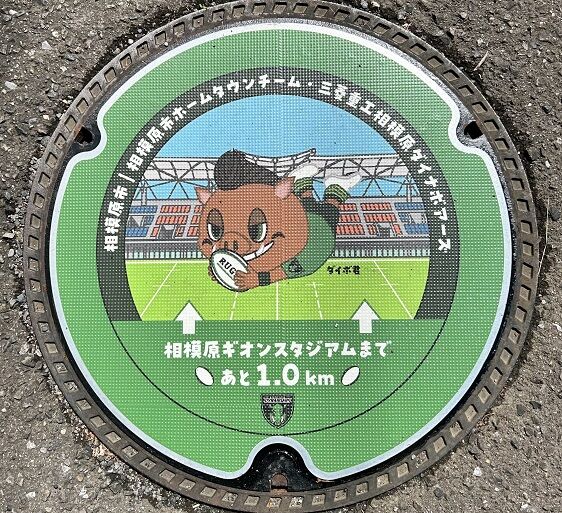 「三菱重工相模原ダイナボアーズ」の蓋で「ダイボ君」とスタジアムがデザインされています。「ワークマンプラス相模原原当麻店」の前の歩道に有りました。