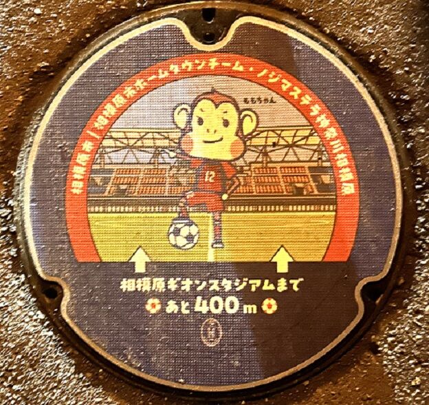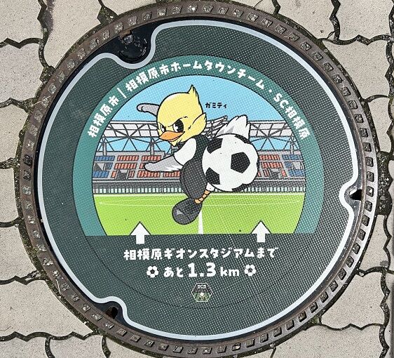 次の3枚の蓋と共に地元チームの応援蓋で「相模原ギオンスタジアム」への案内を兼ねてJR相模線原当麻駅から「相模原ギオンスタジアム」への道の歩道に設置されています。J3「SC相模原」の蓋でクラブマスコット「ガミティ」とスタジアムがデザインされています。原当麻駅東口の1番バス停に有りました。
