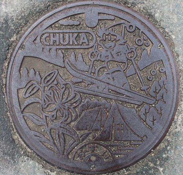 旧中和(ちゅか)村の蓋で村の花ササユリと津黒高原でのキャンプとスキーをする様子がデザインされています。中和郵便局の近くの路上に有りました。