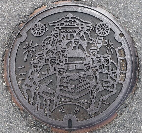 旧久世町の蓋で「だんじり祭り」がデザインされています。久世2281-3の路上に有りました。
