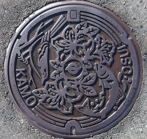 旧加茂町の蓋で町章と町の花皐月、町の鳥鶯、町内を流れる加茂川に棲む山女がデザインされています。JR因美線美作加茂駅の近くの路上に有りました。