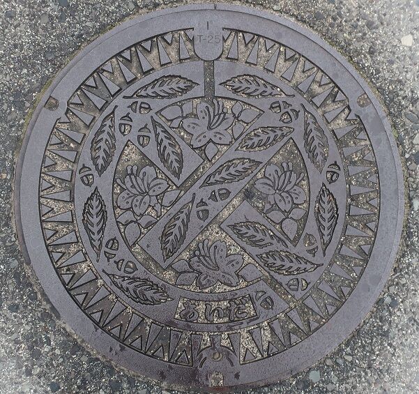 旧英田町の蓋で町の花躑躅と判り難いですが中央の〇と✖は「ア」と「イ」の町章でその中に町の木樫の葉がデザインされています。福本786の路上に有りました。