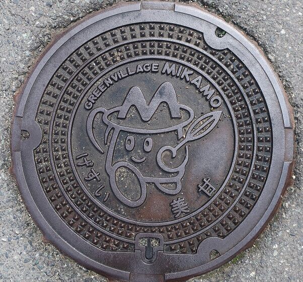 旧美甘村の蓋で村のマスコットキャラクター「みかもん」がデザインされています。美甘3982に在る「しげや旅館」の近くの路上に有りました。
