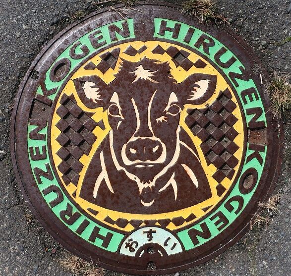 旧八束村の蓋で蒜山と「ジャージー牛」がデザインされています。蒜山上長田545に有りました。